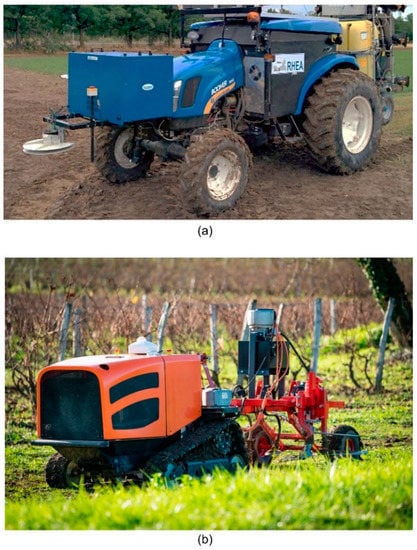 (a) Agricultural robots based on retrofitted conventional vehicles (RHEA fleet); (b) agricultural robots designed on purpose (Courtesy of AgreenCulture SaS).