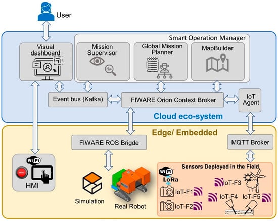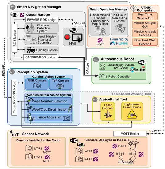 In our application, the selecting references are made with the smart navigation manager (mission planner), the measures of the magnitudes of interest are performed with the perception system and the IoT sensor network, the decisions are made with the smart navigation manager (smart operation manager), and the actions are executed with the agricultural tool and the autonomous robot that move the implement throughout the mission field. In addition, our system also takes care of the interaction with the cloud and the operator. In our proposed integration method, these components are grouped into modules, as illustrated in Figure 2 and Figure 3. These modules are as follows.