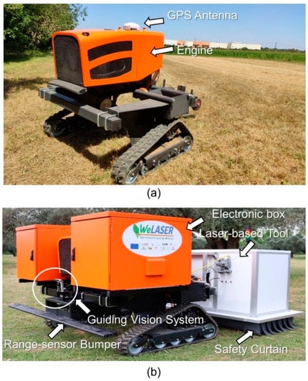 (a) Mobile platform (AgreenCulture SaS) and (b) autonomous laser weeding system.