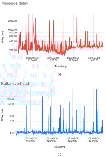 - Traffic information: The ROS functionalities mentioned above revealed that during a field experiment (10 min duration), the total number of delivered messages was 2,395,692, with a rate of only 0.63% dropped messages (messages that were dropped due to not having been processed before their respective timeout), with average traffic of 10 MB/s and maximum traffic of 160 MB at any instant of time. No critical messages (command messages) were lost, demonstrating robustness within the smart navigation manager. Regarding cloud traffic, during a period of time of approximately 3 h, the messages sent to the cloud were monitored, where the number of messages received by the cloud was measured; the delay time of the transmission of the messages between the robot (edge) and the OCB, and between the robot and the KAFKA bus (see Figure 3), were also measured. During this interval of time, around 4 missions were executed, and a total of 14,368 messages were sent to the cloud, mainly the robot status and the perception system data. An average delay of about 250 ms was calculated between the moment the message is sent from the robot and the moment it is received in the OCB (see Figure 11a). Moreover, the KAFKA overhead, i.e., the time it takes for a message received by the OCB to be forwarded to the KAFKA bus and eventually processed by a KAFKA consumer, was approximately 1.24 ms, demonstrating that the internal communications within the server and hosted cloud services are robust (see Figure 11b).