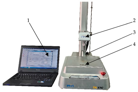 Uniaxial compression test of buckwheat seeds: (1) control panel; (2) texture analyzer; (3) detection probe; and (4) buckwheat seeds.