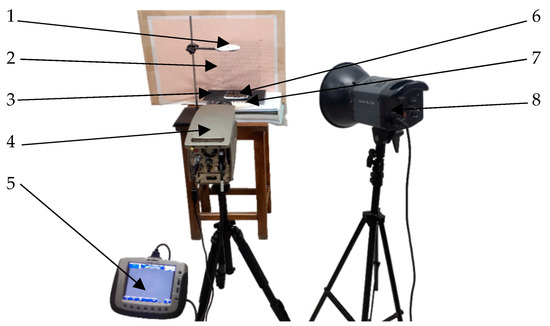 Drop test device: (1) drop frame; (2) coordinate paper; (3) PLA plate; (4) high-speed camera; (5) control panel; (6) buckwheat seed plate; (7) buckwheat seeds; and (8) lighting.