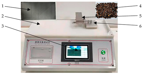 Friction coefficient test device: (1) PLA plate; (2) objective table; (3) control panel; (4) buckwheat seed plate; (5) tractor; and (6) slider.