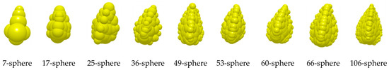 The manual filling 7-sphere and automatic filling multi-sphere particle models of buckwheat seeds were established, as shown in Figure 6. The automatic filling multi-sphere particle models include 17-sphere, 25-sphere, 36-sphere, 49-sphere, 53-sphere, 60-sphere, 66-sphere, and 106-sphere, respectively. These models were used to study the influence of different filling quantities on the simulation results.