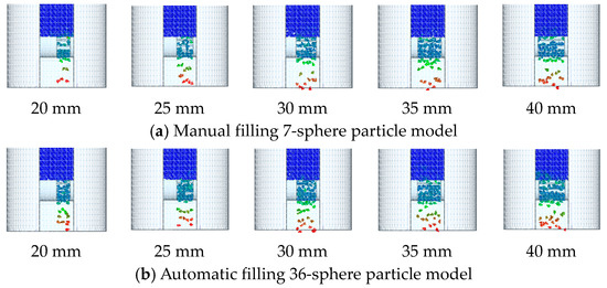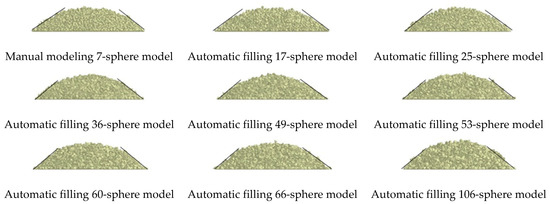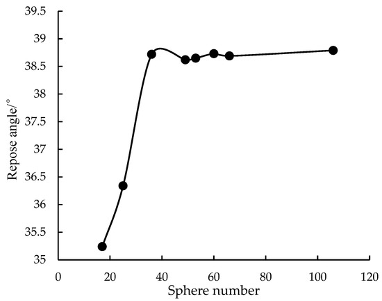 As shown in Figure 7, the simulation results of the repose angle of both manual filling 7-sphere and automatic filling multi-sphere particle models are larger than the measured value (29.79°) of the bottomless cylinder method. The different sphere numbers of the automatic filling multi-sphere particle models have great influence on the simulation results of the repose angle, as shown in Figure 8.