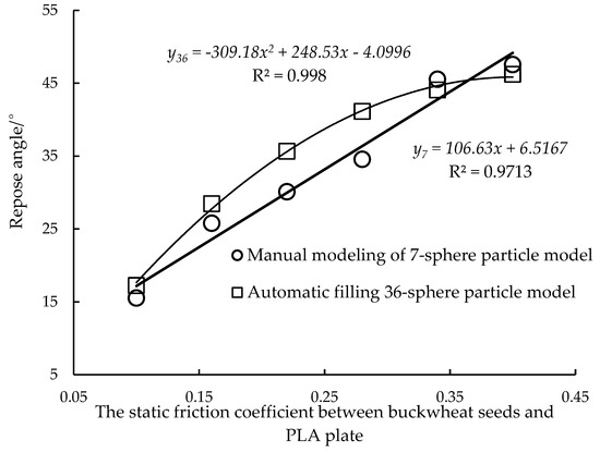 As shown in Figure 9, the results show that when the 7-sphere manual filling particle model is used, the repose angle of buckwheat seeds and the static friction coefficient between buckwheat seeds and the PLA plate are linearly related, and when the 36-sphere automatic filling particle model is used, the repose angle of buckwheat seeds and the static friction coefficient between buckwheat seeds and the PLA plate has a quadratic polynomial function; the determination coefficients are 0.971 and 0.998, respectively.