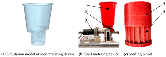Seed-metering device: (1) seed box; (2) seed-metering device; (3) speed motor; (4) baffle plate; and (5) slot wheel.
