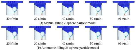 The simulation results of different rotation speeds of the seeding wheel are shown in Figure 11. When the effective working length of the seeding wheel is 40 mm, the seeding rate increases with an increase in the rotation speed of the seeding wheel. For the manual filling 7-sphere particle model, when the rotation speed of the seeding wheel is less than 30 r/min, the discharged seed flow is uniform; on the other hand, when the rotation speed is greater than 40 r/min, the discharged seed flow is discontinuous. For the automatic filling 36-sphere particle model, with an increase in the rotation speed, the seed flow also shows a trend of uniform and then discontinuous; the difference is that the critical rotation speed is increased.