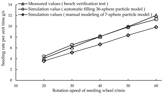 Figure 13 shows the measured and simulated values of the seeding rate per unit time at different rotation speeds of the seeding wheel, when the effective working length of the seeding wheel is 40 mm. With an increase in the rotation speed, both measured value and simulated value of seeding rate per unit of time increase linearly. The average relative error between the measured value and the simulated value of the manual filling 7-sphere particle model and the automatic filling 36-sphere particle mode is 15.85% and 4.69%, respectively.