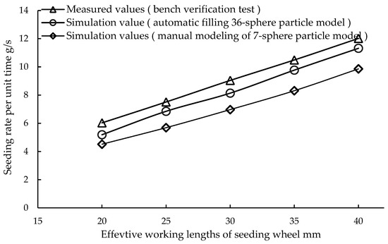 Figure 14 shows the measured and simulated values of the seeding rate per unit of time at different effective working lengths of the seeding wheel, when the rotation speed of the seeding wheel is 60 r/min. With an increase in effective working length, both measured value and simulated value of seeding rate per unit time increase linearly. The average relative error between the measured value and the simulated value of the manual filling 7-sphere particle model and the automatic filling 36-sphere particle mode is 22.18% and 9.07%, respectively.