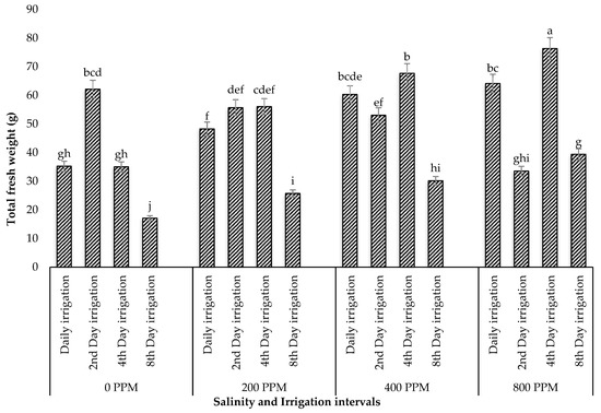 Effect of salinity and irrigation intervals on total fresh weight of M. crystallinum. Means (bars) that share the same letter do not vary significantly according to Tukey’s test (p ≤ 0.05).