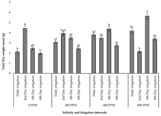 Effect of salinity and irrigation intervals on total dry weight of M. crystallinum. Means (bars) that share the same letter do not vary significantly according to Tukey’s test (p ≤ 0.05).