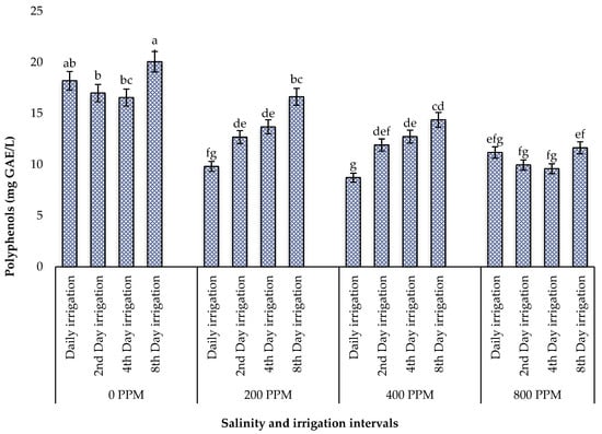 Effect of salinity and irrigation intervals on total polyphenols of M. crystallinum. Means (bars) that share the same letter do not vary significantly according to Tukey’s test (p ≤ 0.05).