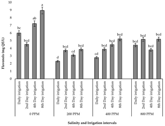 Effect of salinity and irrigation intervals on total flavonols of M. crystallinum. Means (bars) that share the same letter do not vary significantly according to Tukey’s test (p ≤ 0.05).