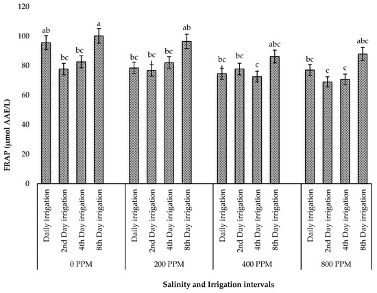 Effect of salinity and irrigation intervals on FRAP capacity of M. crystallinum. Means (bars) that share the same letter do not vary significantly according to Tukey’s test (p ≤ 0.05).