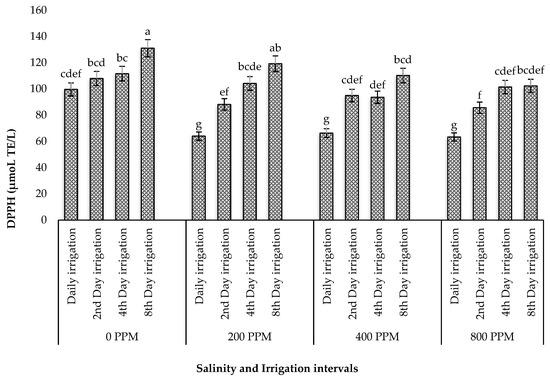 Effect of salinity and irrigation intervals on DPPH capacity of M. crystallinum. Means (bars) that share the same letter do not vary significantly according to Tukey’s test (p ≤ 0.05).