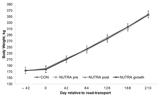 | Post-transport BW (d 0; kg) | 181 | 178 | 179 | 177 | 12.4 | 0.61 |