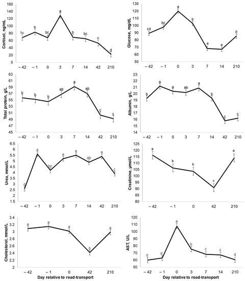 - Takemoto, S.; Tomonaga, S.; Funaba, M.; Matsui, T. Effect of Long-Distance Transportation on Serum Metabolic Profiles of Steer Calves. Anim. Sci. J. 2017, 88, 1970–1978. [Google Scholar] [CrossRef]