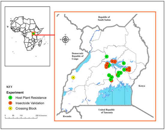 Cassava in Uganda is the second most important staple food crop after bananas. It is mostly grown by smallholder farmers and contributes approximately 22% of the total farmer households’ cash incomes [1]. The crop is traded domestically as fresh roots, dry chips, grits and high-quality flour (HQF). It provides 20% of the total national calorie intake with an annual per capita consumption estimated at 119 kg [2]. It is largely grown by 3.9 million smallholder farmers in all regions, in descending order, in the Northern, Eastern, Central and Western regions [3]. The crop is available all year round and contributes to essential nutrients such as carbohydrates, vitamins and minerals [4]. Cassava yields, however, are adversely affected by pests such as whiteflies, mites, thrips and scale insects, which cause significant losses through their feeding damage leading to low cassava productivity (leaves and roots) [5]. The two viral diseases, cassava mosaic disease (CMD) and cassava brown streak disease (CBSD), reduce yields by over 40% (i.e., 42%—CMD; 55%—CBSD) in susceptible varieties [6,7,8].