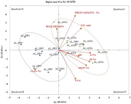 The PCA extracted two components with more than 69% cumulated variance for all the investigated physical, chemical, and biological (mycorrhizal functional traits) parameters. The distribution of component loadings and scores is shown in Figure 3. Component 1 (F1) represents a gradient of plant genotype; in particular, grafted vines (AL-420A) are in quadrants I and II and own-rooted vines of cv ‘Aleatico’ are in quadrants III and IV, indicating genotype-base effects. Concerning soil physical traits, the clay content (%) in the topsoil showed a significant negative Pearson correlation coefficient with mycorrhizal colonization parameters (Table 4), such as intensity of mycorrhizal colonization (M) (−0.57) and frequency of arbuscules (A) (−0.66), and with soil water content at field capacity (SFWC) (−0.62), C/N ratio (-0.63), and TOC (−0.45). Positive Pearson correlation coefficients were shown for clay content and vesicles (V) (0.69) and between C/N ratio and soil water content at field capacity (SFWC) (0.58), intensity of mycorrhizal colonization (M) (0.55), and abundance of arbuscules (A) (0.61). Positive Pearson correlation coefficients were also shown between (i) soil water content at field capacity (SFWC) and frequency of arbuscules (A) (0.45) and (ii) pH and MyCP (0.47), M (0.55), and A (0.55).