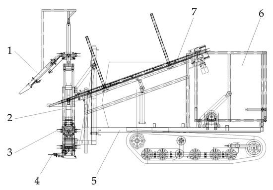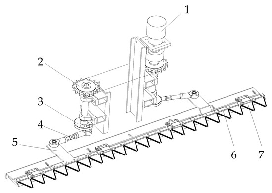 Structure diagram of the cutting device. 1. Hydraulic motor; 2. sprocket drive device; 3. eccentric disc; 4. articulated bearing components; 5. connecting arm; 6. blade-fixing rod; 7. blade.