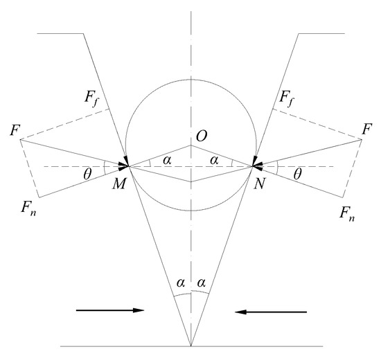 According to the force balance condition, the critical equilibrium condition for the stalk to be clamped and not slide is that the magnitude of the resultant force F at the contact points M and N between the blades and the stalk is equal and opposite, and they are on the same line. At this point, the cutting angle α of the blade is equal to the friction angle θ, which indicates that the condition for the stalk to be stably clamped by the blade is that the cutting angle of the blade is less than or equal to the friction angle, i.e.,