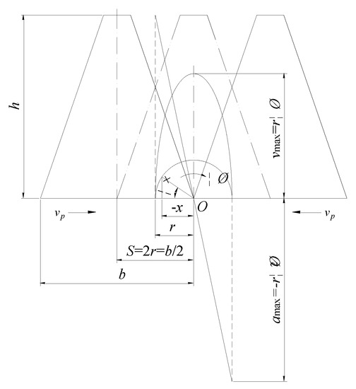 It is known that there is an elliptical equation between the movement speed v and the displacement x of the blade. When x = 0, the blade’s movement speed is at its maximum, and at this time, vmax = rω. When x = ± r, that is, when a certain point on the cutting edge is in the extreme left or right position of the blade, the blade’s movement speed is at its minimum and the acceleration is at its maximum. At this time, v = 0 and vmax = rω2.