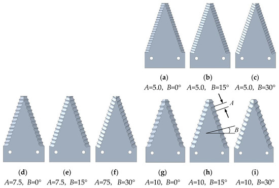 To facilitate the comparative study of the effects of different tooth pitch and tooth angle of bionic blades on cutting energy consumption, three-times the size of the biomimetic prototype (mouthparts palate of batocera horsfieldi) dimensions, i.e., 5.0 mm, 7.5 mm, and 10 mm, are used as tooth pitch sizes, and the mouthparts palate of batocera horsfieldi is shown in Figure 5. The biomimetic principle involves using MATLAB image processing software to extract boundary point data of the arc-shaped contour of the mouthparts palate of batocera horsfieldi. After the extraction of the boundary points, curve fitting is performed on these points, and the fitted curve is then used as the design for the blade edge of the cutting blade [12]. For each tooth pitch, three tooth angles of 0°, 15°, and 30° are set for the blades. As a result, there are nine different combinations of blades with different tooth pitches and tooth angles. The different types of blades are shown in Figure 6, with their respective tooth pitch and tooth angle parameters listed in Table 1.