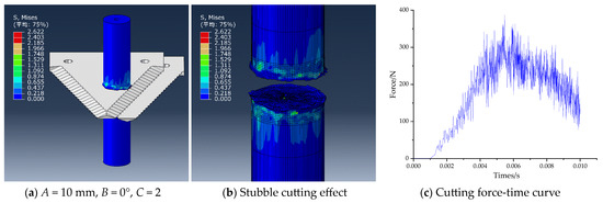 The experimental design and analysis using Design-Expert software, experimental plan, and results are shown in Table 4. Taking experiment No. 13 as an example, the numerical simulation results, stubble cutting effect, and cutting force–time curve are shown in Figure 7.