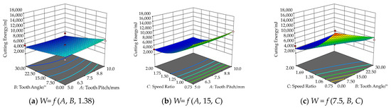 As can be seen from the variance analysis of the regression model mentioned above, the interaction between factors has a significant impact on the model. Therefore, the interaction between factors cannot be ignored. In this study, one factor was fixed at the middle level, and the interaction effects of the other two factors on the evaluation index were analyzed. Response surface plots were generated (as shown in Figure 8) to analyze the effects of the three factors, namely pitch, tooth angle, and speed ratio, on the cutting energy consumption index.