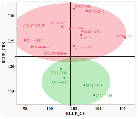 Figure 4. In the graphs, each vertical dotted line of the Average Environmental Coordinate (AEC) represents the average and the stability of BLUP_CY and BLUP_CRS estimates of each genotype across all test locations. The solid line perpendicular to the AEC is the mean population of the evaluated germplasm. The BLUP_CY and BLUP_CRS of the genotypes on the left of the solid line are higher than the population means, and the farther away any genotype is from this line, the higher the BLUP_CY or BLUP_CRS estimates. Thus, genotypes G14 (CP 96-1252), G11 (CP 14-4486), G1 (CL 88-4730), G3 (CP 13-1644), G4 (CP 13-2340), G13 (CP 14-4602), and G5 (CP 14-4165) had the highest BLUP_CY mean (