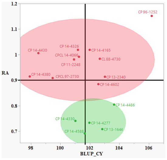 19]. If the ranks based on average BLUP_CY, BLUP_CRS, RA, and stability are weighted equally, CP 14-4165 (G5) would be selected. CP 13-2340 (G4) showed BLUP_CY to be above the mean, with an average RA and high stability, whereas it showed BLUP_CRS to be above the mean but with high instability across locations.