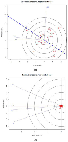 65] reported that dry biomass yield was significantly lower at the PP location than that at the TS location and associated the difference to the low amount of nitrogen regularly applied at the PP location. Despite the lack of information about the PF location regarding fertilization doses and rates, our study suggests that TS and PF have similar fertility levels based on the acute angles between them for CY and CRS content.