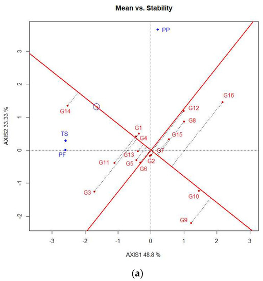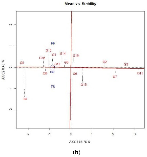 Figure 5a shows that the three locations fall into two mega-environments, and the vortex genotypes of each mega-environment have the highest BLUP_CY in the locations that fall in the sector. The first mega-environment includes the PF and TS locations, with check CP 96-1252 (G14) being the winner. Check CPCL 97-2730 (G16) was the winner in the second mega-environment containing the PP location. Test genotypes CP 11-2248 (G2), CP 14-4165 (G5), CP 14-4277 (G6), CP 14-4326 (G7), CP 14-4602 (G13), CP 13-2340 (G4), and check CL 88-4730 (G1) were located close to the center of the biplot, indicating that they showed a stable performance of BLUP_CY across the test locations [