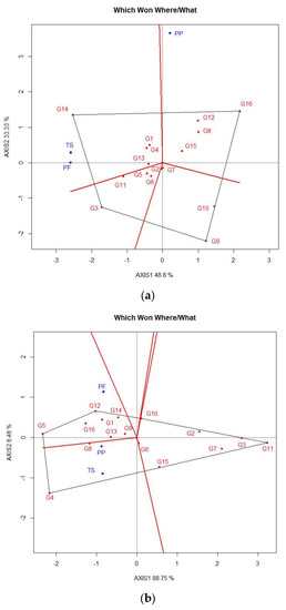 57]. Genotypes at the corners of the polygons divide the biplot area and test locations into sectors; simultaneously, it reveals the suitable genotypes for test locations within each sector or mega-environments (one environment or the combination of several environments) [
