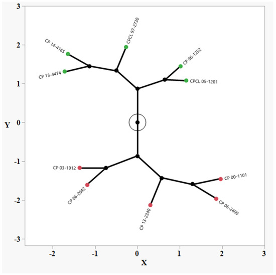 Figure 6). Each group comprised five genotypes, and the genotypes of group 1 were three of the commercial cultivars (CP 96-1252, CPCL 05-1201, and CPCL 97-2730), the recently released cultivar for sandy soil (CP 13-4474), and the test genotype CP 14-4165.