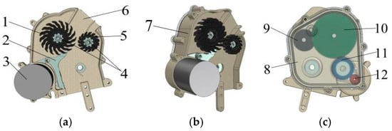 Schematic diagram of seed receiving system. 1. Primary feeder wheel. 2. Seed cleaning claw. 3. Motor. 4. Gear shaft. 5. Auxiliary feeder wheel. 6. Seed receiving port. 7. Gear box. 8. Rear cover. 9. Driving auxiliary feeder wheel gear. 10. Driving primary feeder wheel gear (dual gear). 11. Carrier gear. 12. Motor gear. (a) Front view; (b) Side view; (c) Back view.