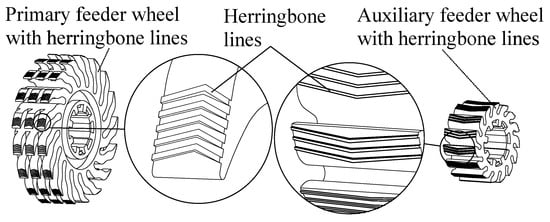 According to the above analysis of the strain placed on the seeds by the feeder wheel during each of the three stages of clamping, transporting, and releasing, increasing the friction coefficient between the feeder wheel and the seeds can significantly improve the clamping force of the feeder wheel on the seeds. Therefore, in this study, herringbone lines were added to the surface of the feeder wheel by taking advantage of the characteristics of a large friction coefficient, good anti-skid performance, and guidance (Figure 8). The primary and auxiliary feeder wheels’ center distances and the addition of herringbone lines can be known to have an effect on the seed receiving effect, while the fingering variable and the feeder wheel speed are known to have an effect on the speed at which seeds enter the seed cavity. In order to investigate the effects of adding herringbone lines, the wheels’ center distance, finger length, and feeder wheel speed on the force and speed of the rotating corn seeds entering the seed cavity, this study conducted simulation experiments using EDEM software.