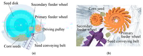 One of the most popular cereal crops in the world and a staple food for millions of people is corn (Zea mays L.) [1]. Corn is a crop that is grown for human consumption as well as for animal feed, the production of biofuel, and industrial uses. Corn planting requires both high quality and high speed because corn has a large planting area, a short planting period, and the quality of the planting directly affects the yield [2]. A typical seed guide tube is designed for low-speed operation and has a straightforward structure. A serious collision between the seeds and the seed guide tube’s inner wall occurs when seeds are sown at high speeds, which reduces the seed placement accuracy and leads to uneven sowing. The belt-type seed guide device uses synchronous seed transportation by the seed conveying belt, which reduces violent collisions during seed transportation, ensures that seeds are discharged from the seed metering device in a uniform and orderly state, and can meet the demands of precision seeders operating at high speeds [3,4]. A belt-type high-speed corn seed guiding device with a seed receiving system created by the Precision Planting Company can actively restrain the corn seeds as they enter the seed cavity from the seed disk, improving their stability and enabling high-speed, precise sowing at a speed of 16 km/h. The feeder wheel’s seed-receiving mechanism, however, has not been the subject of any research, and it is unclear what variables influence how well it receives seeds. Therefore, this study investigated the seed receiving mechanism of the seed guiding device, enhanced key components, and carried out related experiments, which will be crucial for high-speed corn sowing in the future.
