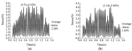 Effects of the feeder wheel with and without herringbone lines on the stress of seeds. (a) Line graph of the stress change of corn seeds with herringbone lines. (b) Line graph of the stress change of corn seeds without herringbone lines.