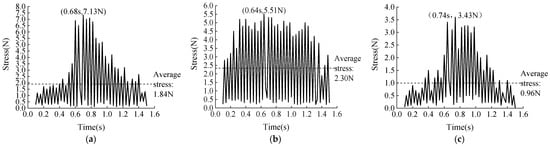 Effect of the different wheels’ center distance on the stress of corn seeds. (a) Line graph of the seed stress change when the wheels’ center distance was 35 mm. (b) Line graph of the seed stress change when the wheels’ center distance was 37 mm. (c) Line graph of the seed stress change when the wheels’ center distance was 39 mm.