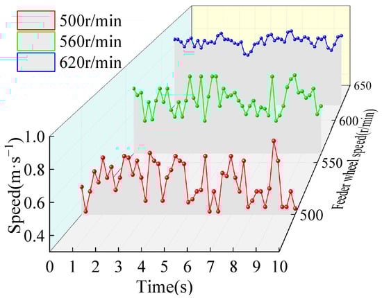The wheels’ center distance was set to 37 mm, and the finger length was set at 12 mm, in order to examine how corn seeds changed in the seed cavity as the feeder wheel speed was varied. It was decided that the feeder wheel speed be changed from 500 to 620 r/min, so the feeder wheel speeds were 500, 560, and 620 r/min, respectively, to meet the needs of the actual sowing operation and account for the clamping effect of the feeder wheels on seeds. Figure 13 illustrates the changing trend of the speed of corn seeds entering the seed cavity at various rotational speeds by setting up a speed monitoring block in the seed cavity and recording the seed speed passing through the block at any time.
