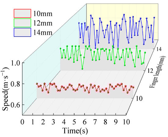 Figure 14 illustrates how the rate at which corn seeds enter the seed cavity generally increases as the finger lengthens. When the finger length was 10 mm, the change amplitude of the speed broken line of seeds was small, which indicates that the speed fluctuation of seeds entering the seed cavity was minimal; when the finger length increased to 12 mm, the speed fluctuation of seeds entering the seed cavity was increased; when the finger length increased to 14 mm, the speed fluctuation of seeds entering the seed cavity was even more increased, indicating an extremely unstable state. By examining the change law of the aforementioned data, it was discovered that reducing the finger length can improve the accuracy of the seed conveying belt by stabilizing the speed of seeds entering the seed cavity. The speed at which seeds enter the seed cavity is, however, relatively slow, which can lessen seed-to-cavity wall collisions but is not appropriate for high-speed seed guiding operations. The speed at which seeds enter the seed cavity can be accelerated by lengthening the finger, but this increases the risk of the high-speed seed guiding operation becoming unstable due to the large fluctuations in the seed entry speed. According to the above study, when the finger length is 12 mm, the seed can enter the seed cavity at a good speed and be maintained at a steady pace. Therefore, by adjusting the finger length, it is possible to alter the rate at which corn seeds enter the seed cavity and achieve a good rate of entry, improving the stability of seed transportation on the seed conveying belt.