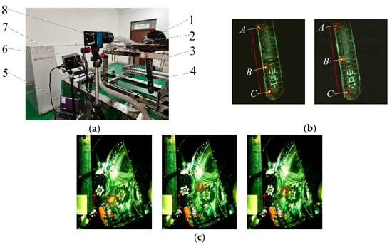 Test equipment for the performance detection of the seed receiving system. 1. Air-suction corn seed metering device. 2. Seed metering drive motor. 3. Belt-type high-speed corn seed guiding device. 4. Seed bed belt. 5. Computer. 6. Seed test controller. 7. LED lighting. 8. High-speed camera. (a) JPS-16 computer vision seed metering test bed. (b) Distribution of seeds in seed conveying belt. (c) Seed receiving process under high-speed camera.