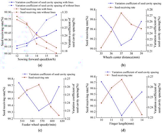 Results of the seed receiving rate and variation coefficient of the seed cavity spacing under bench test. (a) Comparing experimental results with/without herringbone lines; (b) Changes of test index with wheels’ center distance; (c) Changes of test index with the feeder wheel speed; (d) Changes in the test index with finger length.