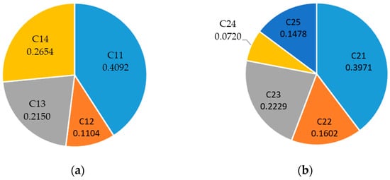 Through SPSSAU software (https://spssau.com/index.html, accessed on 20 April 2023), the eigenvector weights of the two matrices can be calculated, and their consistency can be checked. CI is the consistency indicator, CR is the consistency ratio, and CR < 0.10 means that the consistency test has been passed []. Finally, both B1 and B2 matrices passed the consistency test, and the results of the two matrices are as follows: