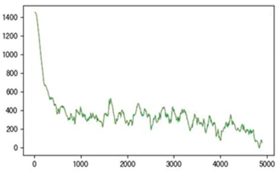 As shown in Figure 3, the gradient in the training process has a significant decline and convergence process. The number of training errors rapidly decreases in the early stage, with approximately 800 episodes entering a convergence state. Subsequent training errors can remain stable at lower values without a surge in training errors. Benefiting from a reasonable neural network structure and parameter selection, the training results are also ideal. Optimizing from around 1400 to around 200 from the beginning of training, compared to other similar studies [], the training error of 200 also represents excellent performance. The trained neural network model can achieve good results on the test set, with the mean square error of only 0.0315381.