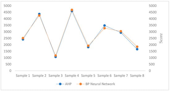 Eight samples are extracted from the data results of completing the BP neural network training, compared with the sample scores calculated by the Analytic Hierarchy Process, and the degree of numerical fitting of the extracted samples is observed to verify the effectiveness and credibility of the results obtained by the Analytic Hierarchy Process. The test results are shown in Figure 4, which is completely within the ideal range. Therefore, it is feasible and ideal to use the BP neural network for poverty early warning.