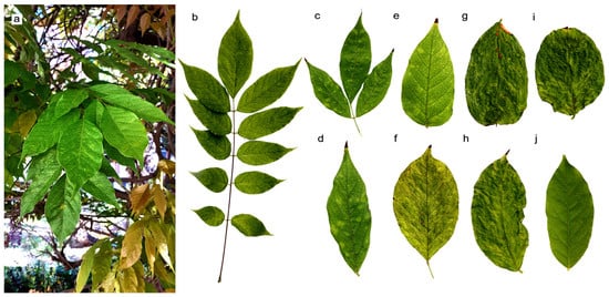 Symptoms of Wisteria mosaic disease (WMD) observed on Chinese wisteria (Wisteria sinensis Sims) ‘Sweet’ leaves, in association with Wisteria vein mosaic virus (WVMV) infection. Milder symptoms on compound leaves varied from yellowing to interveinal diffuse chlorotic spots and irregularly scattered patterns (a,b). Most severely affected leaflets showed mosaic mottling, ringspots, necrotic flecks, twisting, distortions and tip malformations (c–i). The leaflet of a healthy plant without symptoms is shown in (j) for reference.