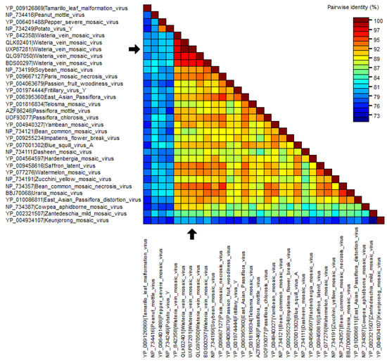 Distance matrix of pairwise MAFFT-based comparison of the partial sequence (116 aa) of the nuclear inclusion protein b (NIb) protein of species members of the genus Potyvirus. The analysis was performed using Sequence Demarcation Tool (SDT) software, version 1.2. Only sequences sharing an aa identity ≥80% with the WVMV isolate Bari (UXP87281, indicated by the arrows) are shown. The full matrix can be found in Table S3. All sequences are identified by their accession number and species name. Detailed information on individual isolates can be found in Table S1.